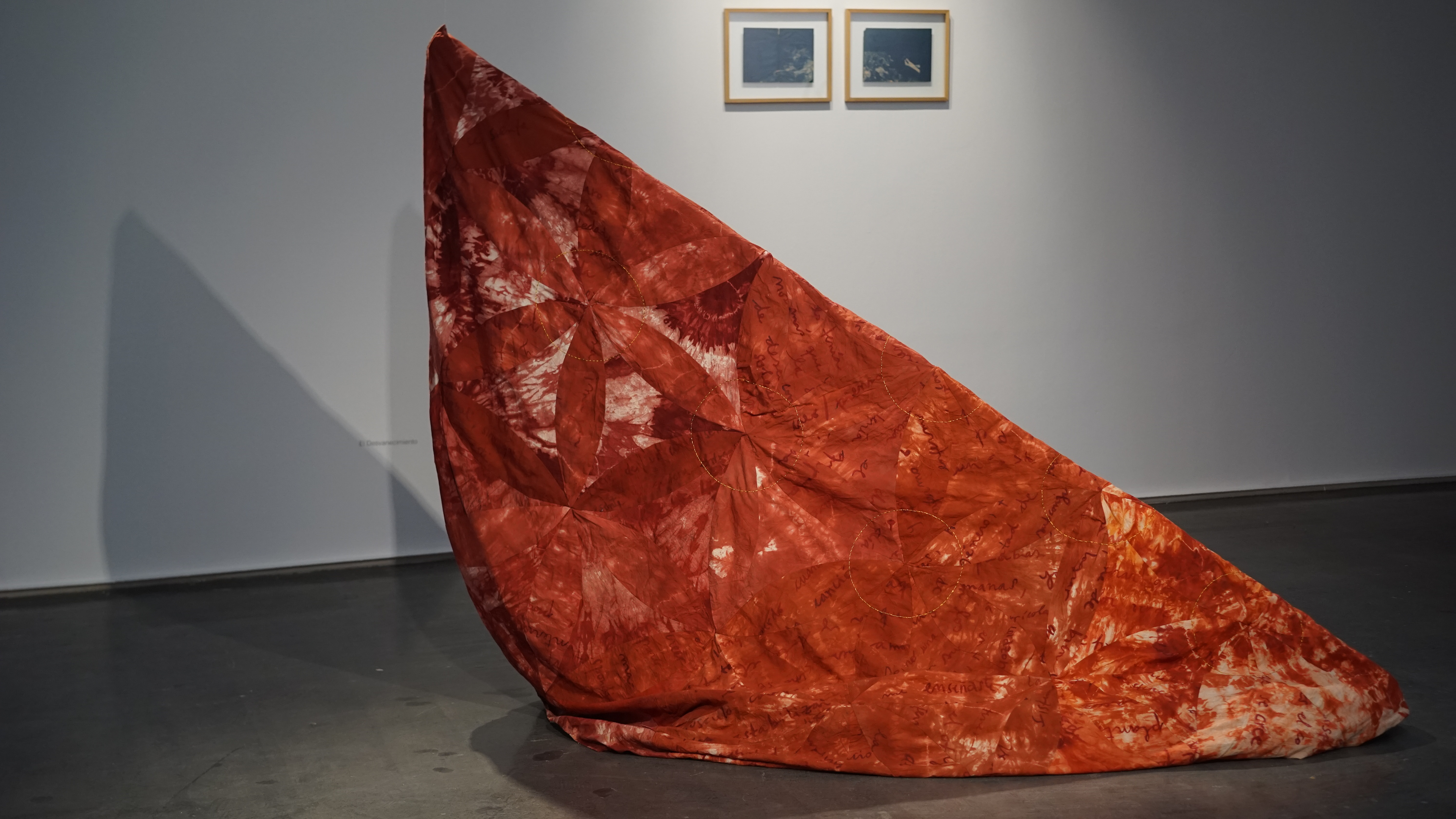 El desvanecimiento (2021). Video registro de acción, 5’ 20”, color, sonido estéreo. Objeto textil teñido con anilina y bordado sobre crea. 180 x 300 x 60 cm.