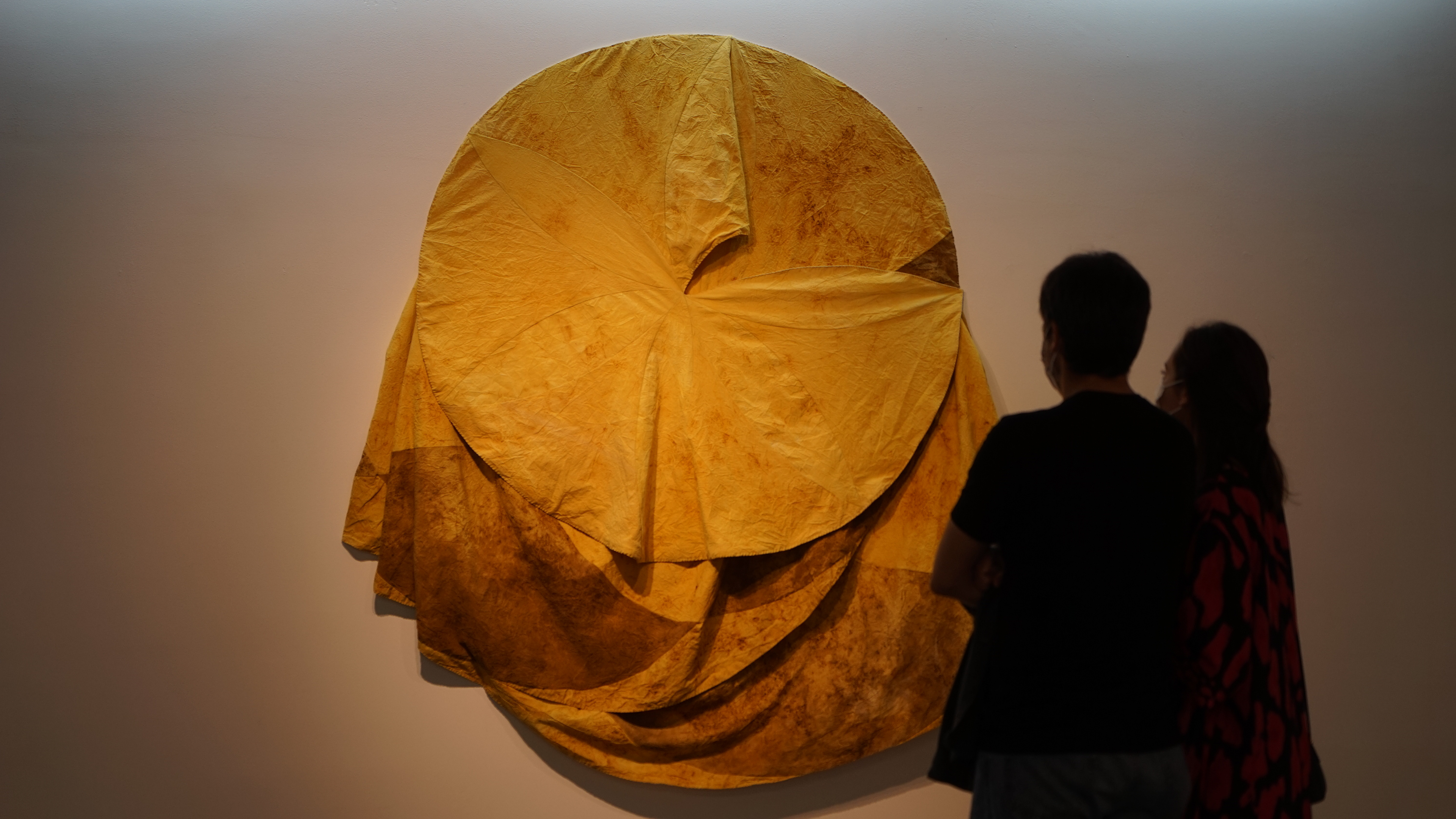 El simiente (2020). Video registro de acción, 3’ 28”, color, sonido estéreo.Objeto textil teñido con cúrcuma y tierra. Objeto 200 x 180 cm.